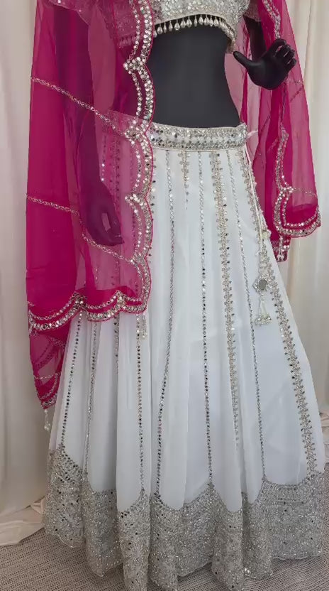 ✨ Ivory White Lehenga Skirt – Flowing layers of fine georgette with silver sequin and mirror work, delicately bordered with intricate embroidery.