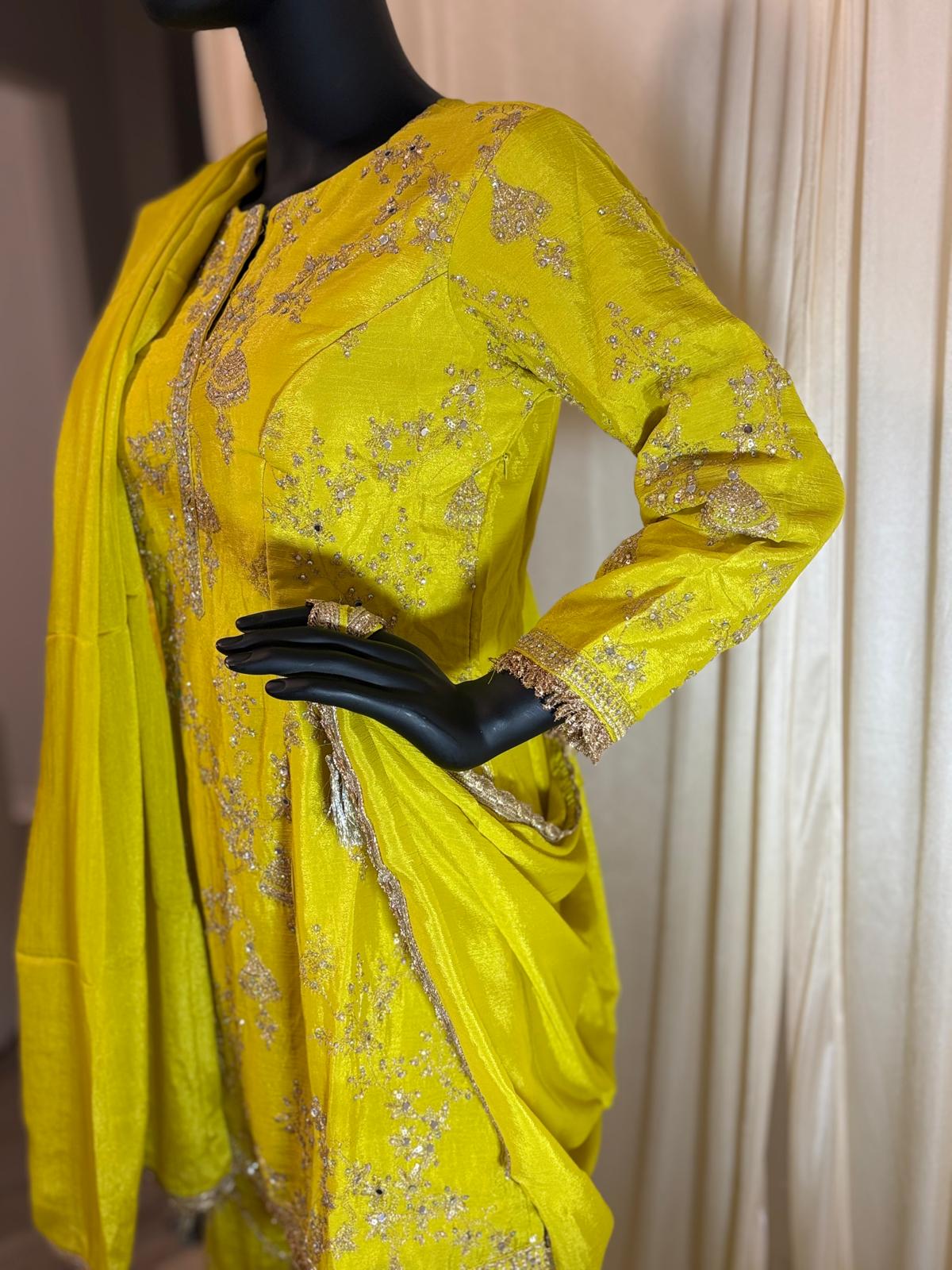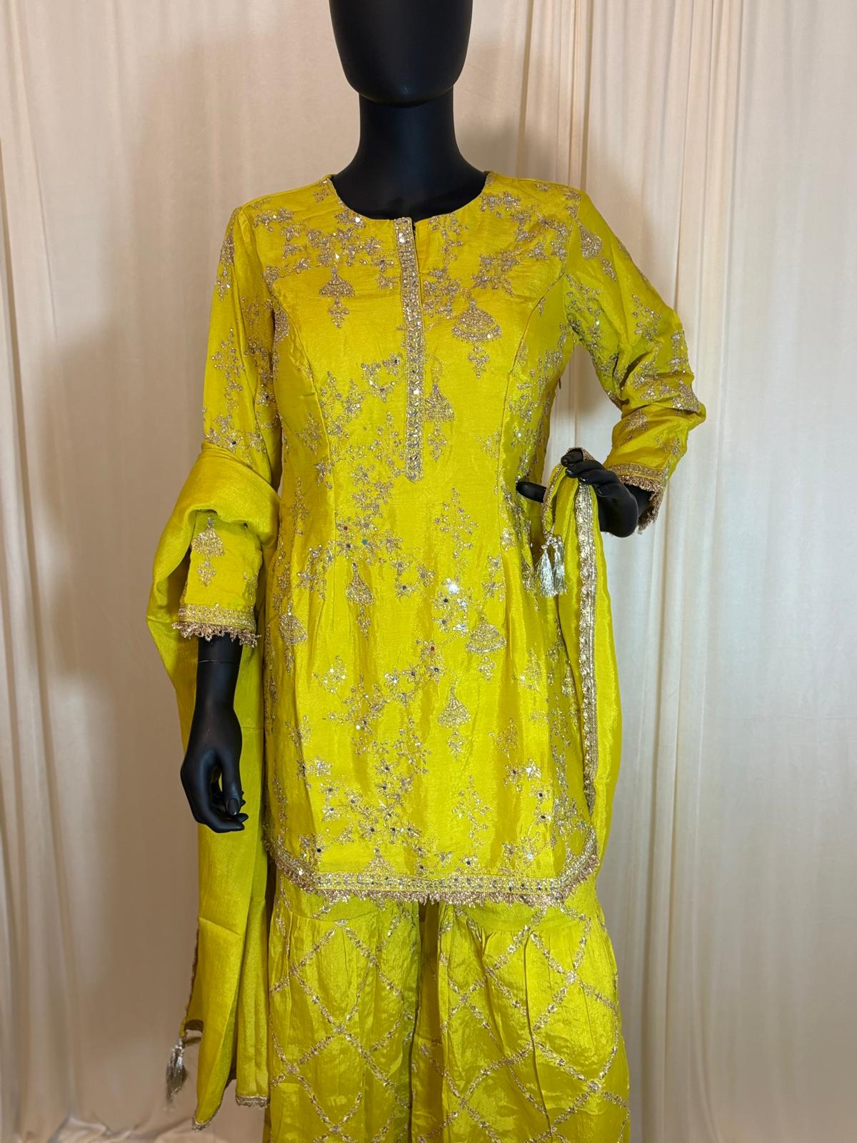 Turn heads with this stunning yellow sharara set, crafted to bring elegance and tradition together. The rich fabric is adorned with intricate silver embroidery and sequin work, creating a timeless festive look. The kurta features delicate embellishments along the neckline, sleeves, and hem, while the matching sharara bottoms showcase a bold lattice design for added charm. Paired with a lightweight dupatta edged in shimmering lace and tassels, this three-piece set is perfect for weddings, festive occasions, and celebrations.