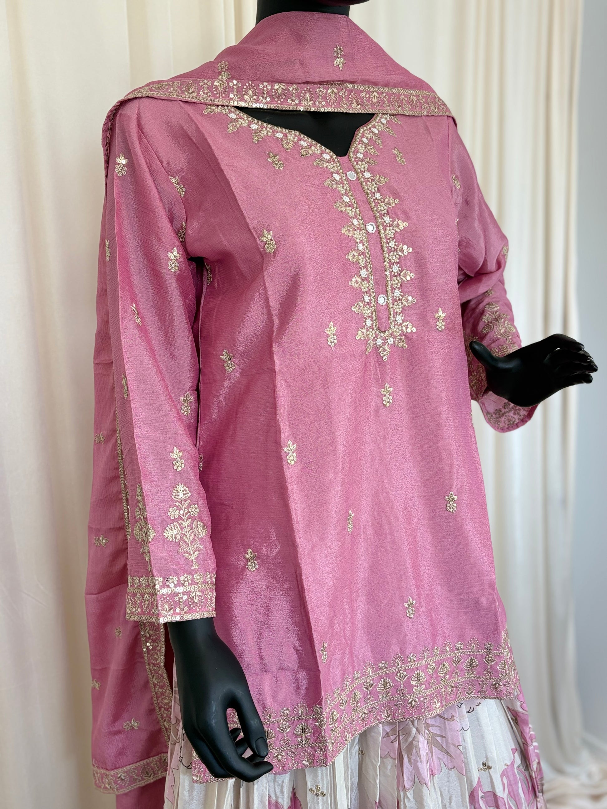 This Rose Pink Skirt Set brings a playful charm with its premium silk kurta adorned in rose pink sequins, beads, cut dana, and golden thread work. Paired with a champagne floral printed skirt and matching dupatta, it’s perfect for adding a splash of elegance and fun to your festive wardrobe.